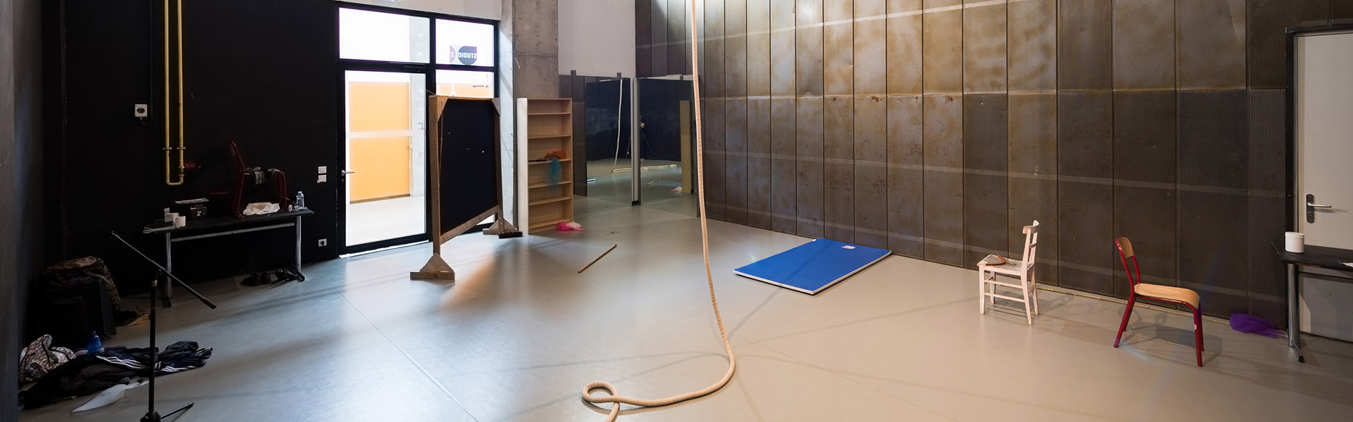ATTENTION, la compagnie dispose d’une salle de travail mais l’accueil en création ne donne pas accès à la salle d’entraînement. Pour accéder aux espaces d’entraînement libre, voir les conditions ici.