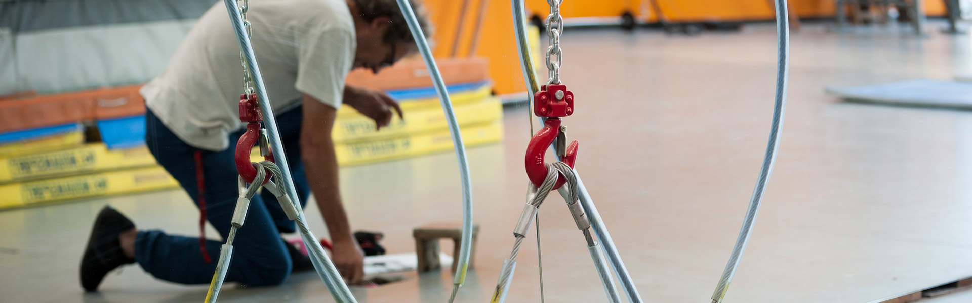 Pour des questions de sécurité, lors de la première installation, toute accroche, aérienne ou au sol, doit impérativement être accompagnée et validée par le responsable technique de la Grainerie avant utilisation de l’agrès. Prendre rendez-vous : michel-golzio(at)la-grainerie.net