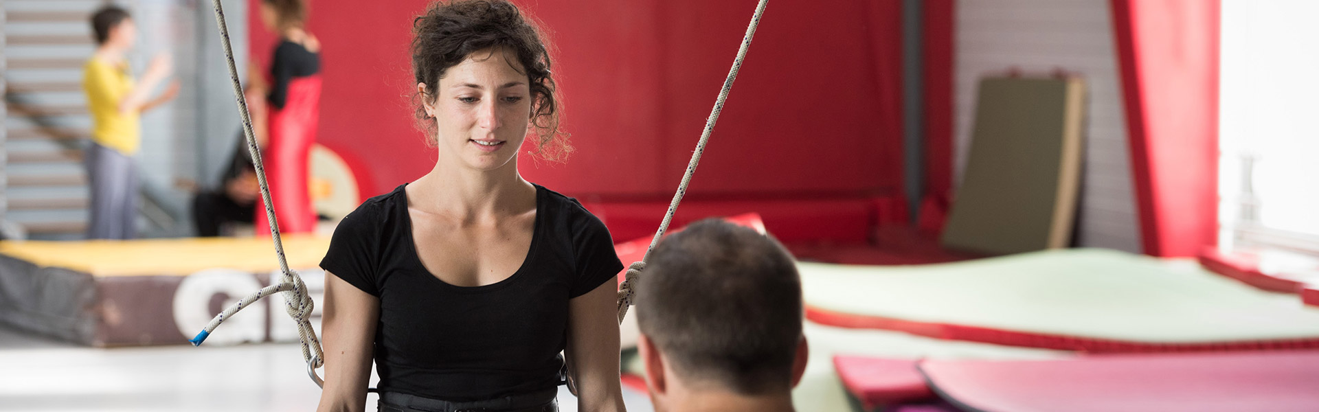 Les portés acrobatiques et le jonglage peuvent se travailler indifféremment dans les deux espaces pourvus de sol sportif. De multiples possibilités d’ancrage et d’haubanage sont prévues. Un espace pour le pratique de la roue cyr au rez-de-chaussée est désormais accessible.