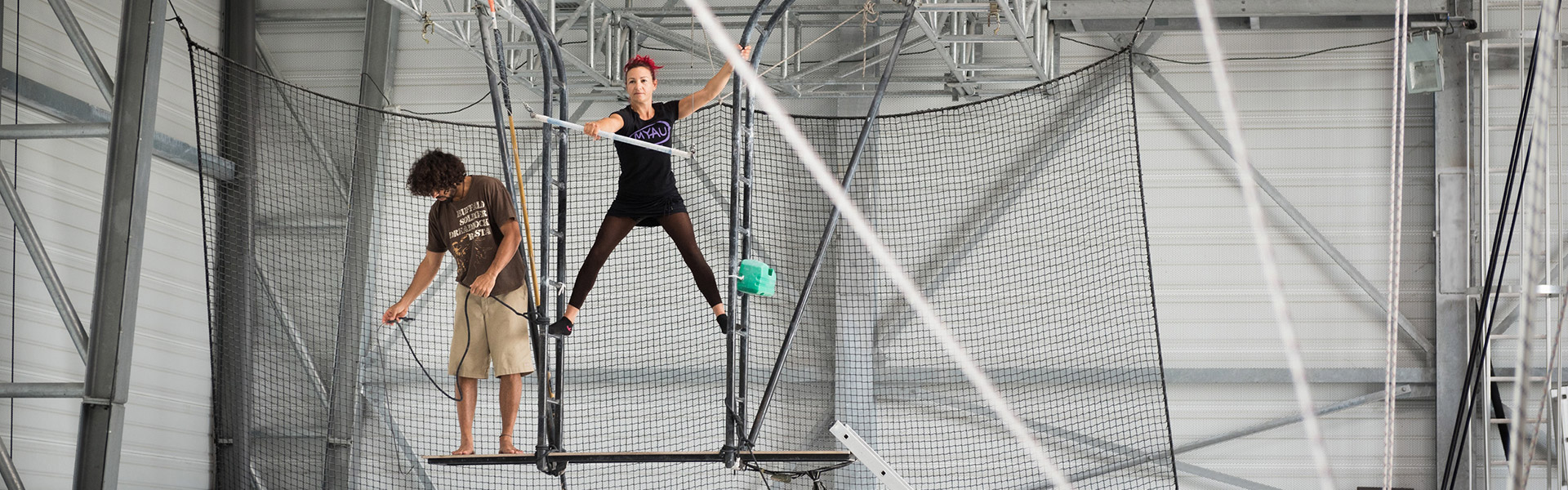 Un espace prioritairement dédié aux fil de férisme, fil souple, mât chinois…est installé sous le filet de réception du trapèze grand volant. Si, pour des techniques de bascule ou balançoire, une grande hauteur est nécessaire, il est possible de replier en partie le filet de réception.